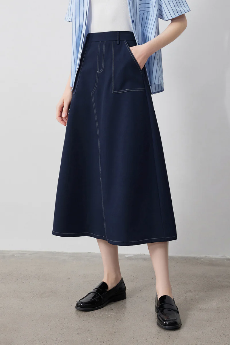 Denim-Inspired High-Waisted A-Line Midi Cargo Skirt