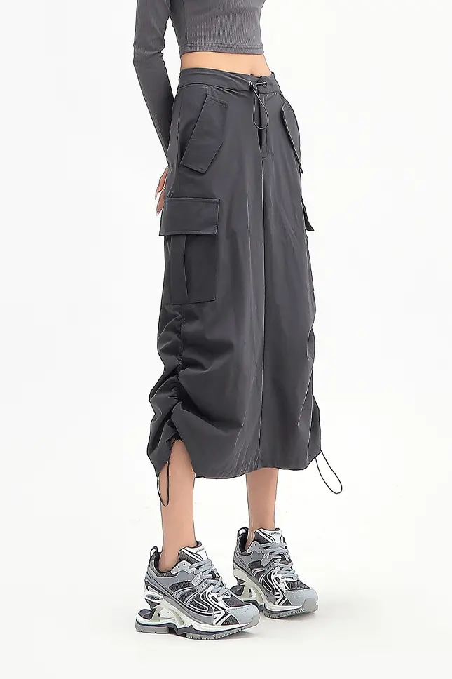 This Grey Cargo Skirt marries utility with style through its unique seam detailing that crafts a slimming effect, while its figure-hugging cut enhances your curves. The deep grey hue exudes a composed elegance, and the practical pocket feature not only adds functionality but also elevates the overall design. Paired with sneakers and mid-calf socks, it effortlessly transitions into a vibrant street-style ensemble, showcasing its versatility.