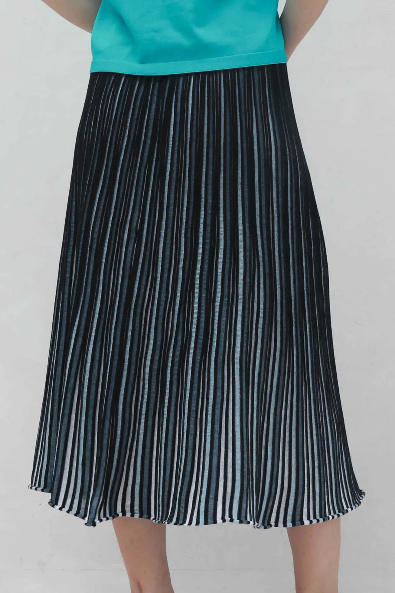 Not your ordinary pleated skirt. Knitted with Italian yarn, its pleats alternate between a gradient of blue and black. Vertical folds extends your silhouette, creating an illusion of longer legs. It's elegant and flows with your movement. Slight blue glimmer adds a hint of whimsy to the design.