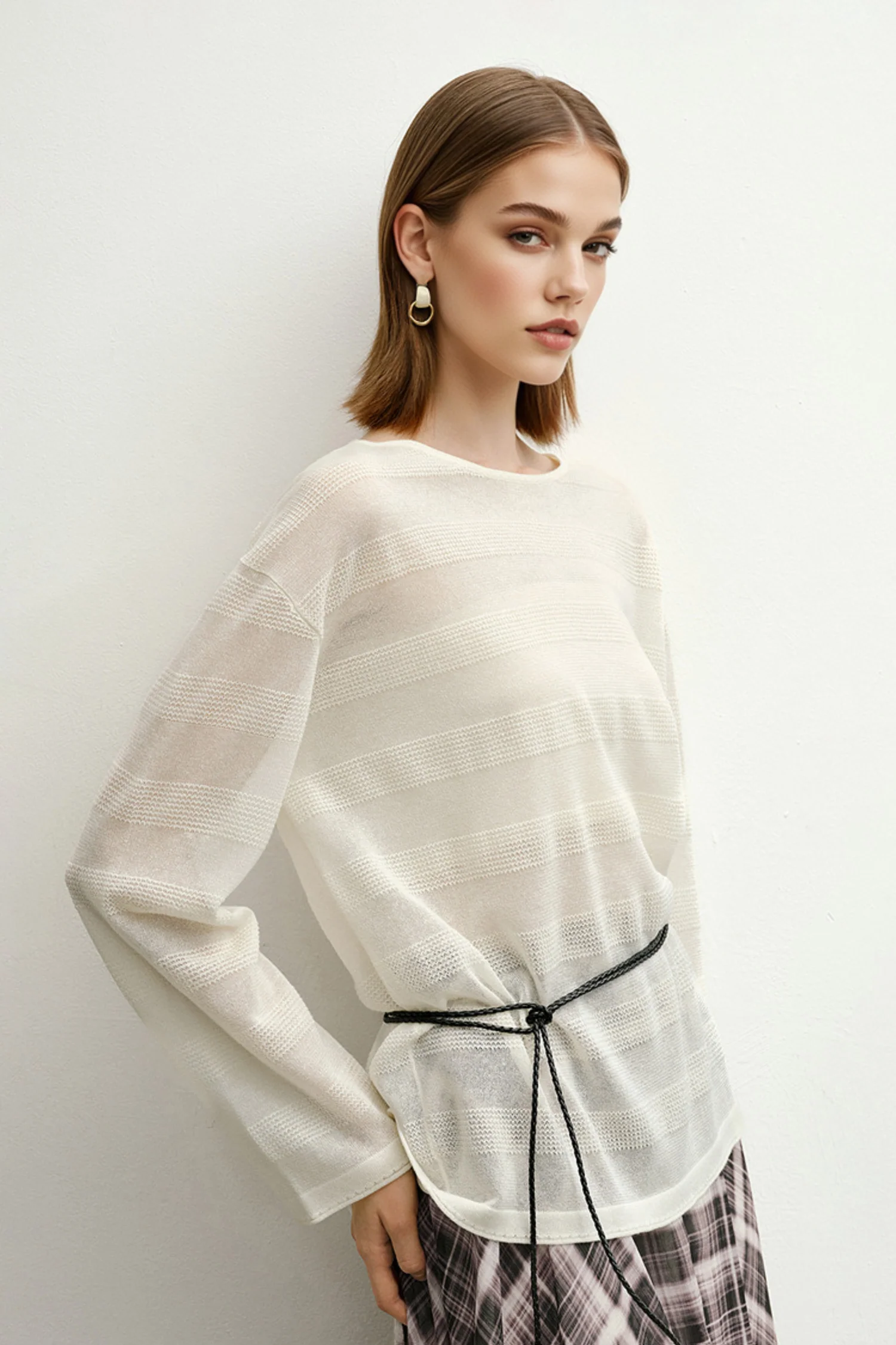 Elevate your basics with this striped t shirt crafted from a soft cotton-linen blend. This long sleeve t shirt with a delicate sheer finish exudes understated elegance. Featuring a white crew neck t shirt design, its perfect for both casual and smart events. The loose fit t shirt ensures comfort and effortless style, making it a must-have in your wardrobe. Pair this white long sleeve t shirt with tailored trousers or denim for a polished, timeless look.