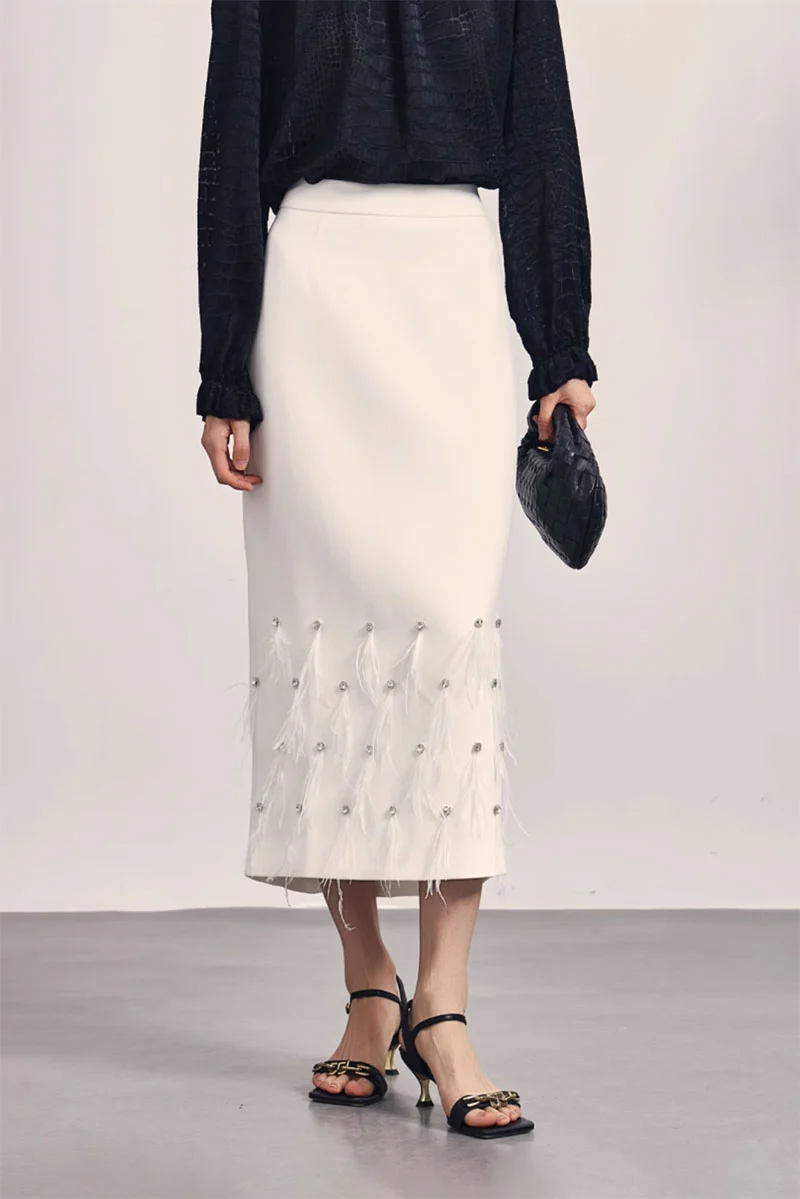 The pencil skirt just got a dazzling upgrade with our Rhinestone-Embellished Pencil Midi Skirt. This high waisted pencil skirt features an elegant design that transitions effortlessly from day to night. Crafted from quality materials, it adds a touch of sparkle with intricate rhinestone detailing. The midi skirt with slit at the back provides ease of movement and a modern touch. Pair it with a simple top for a stylish yet understated look in either white and black midi skirt options.