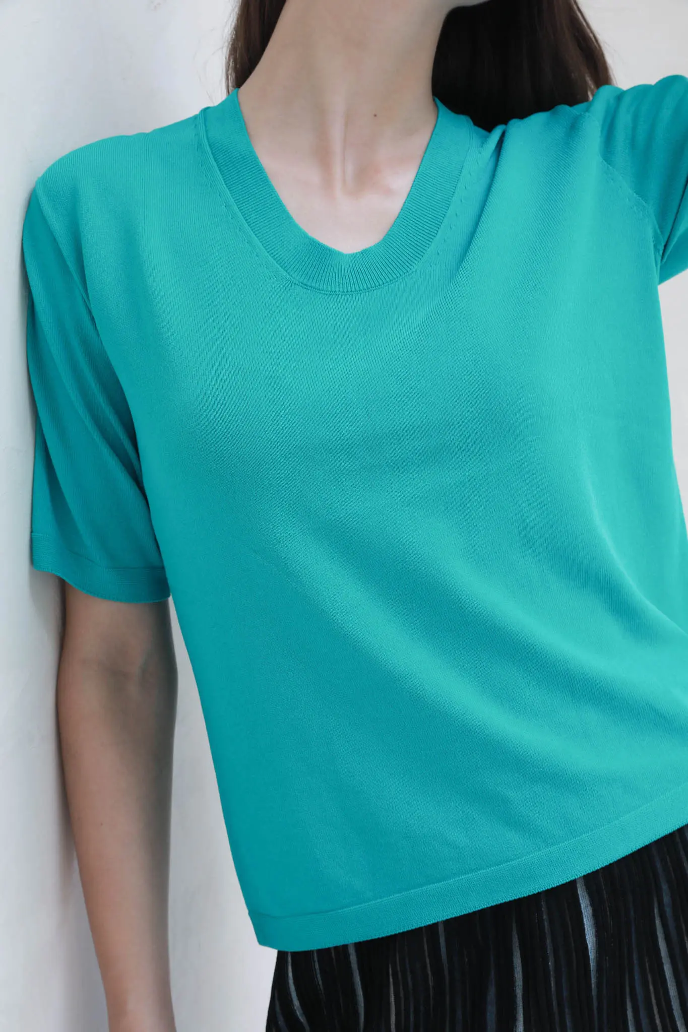 A new spin on the classic tee. This seamless crewneck t shirt is made with Japanese WholeGarment knitting machines, which reduces waste and seams. Sleeve length is close to elbow for a slimming effect on yuor arms.