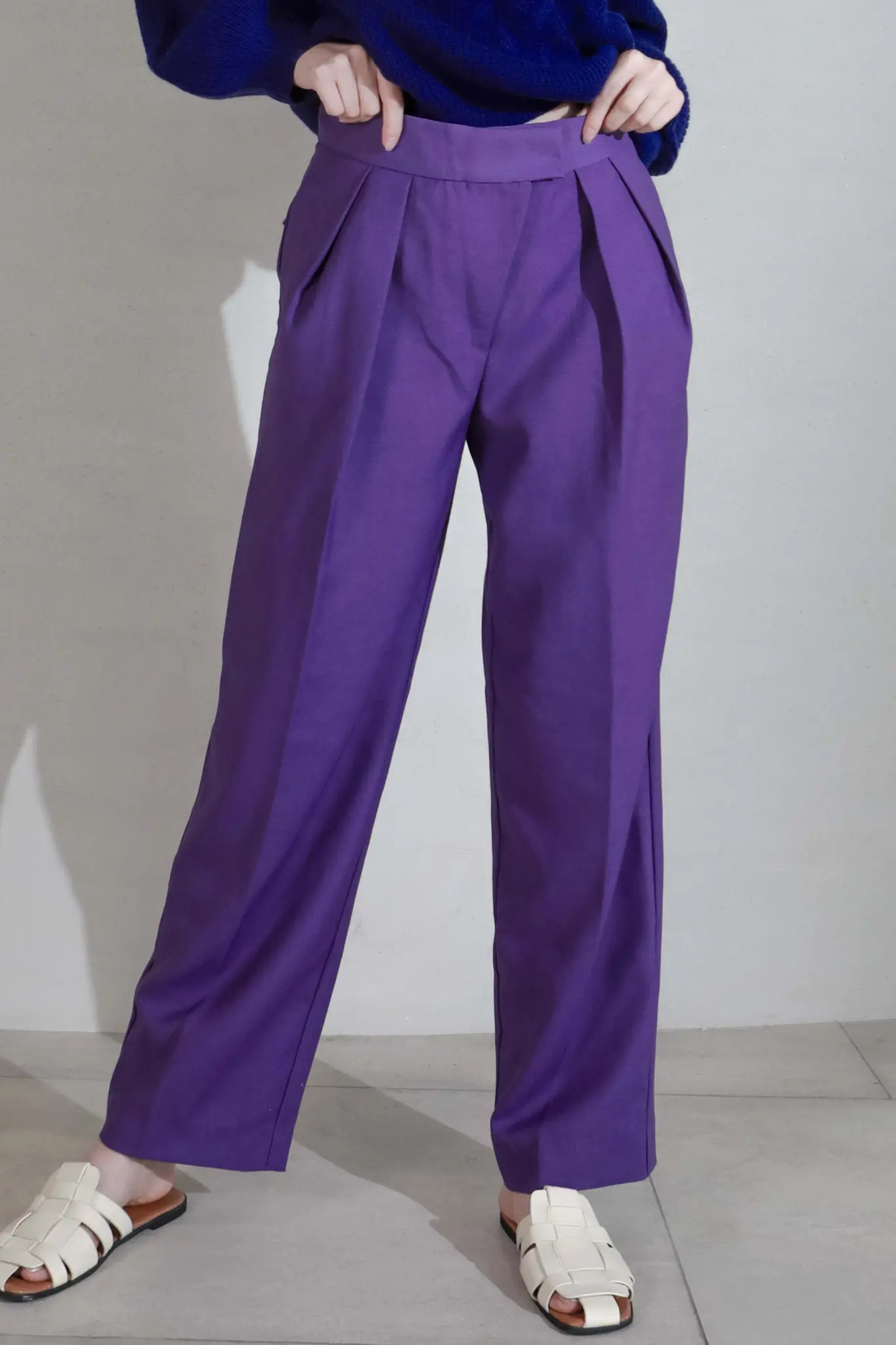 These purple merino woolen pants are high waisted, and features comfortable wide legs. They drape elegantly, and maintains its structure even after washes. Zipper and button closure.